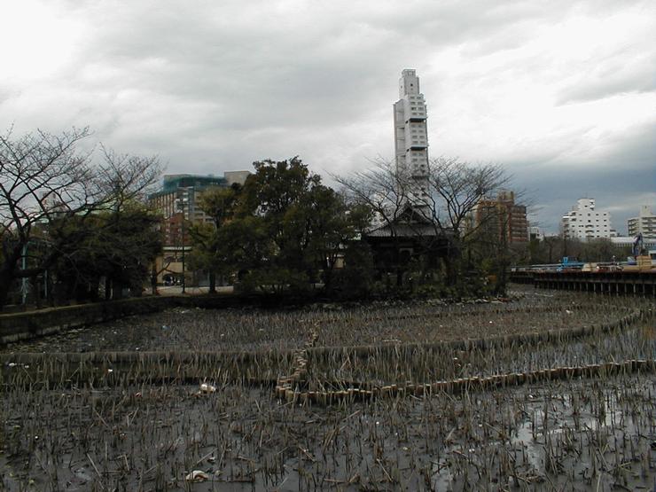 An interesting apartment complex, viewed from Ueno park. The Benzaiten Temple is half-hidden in the trees.