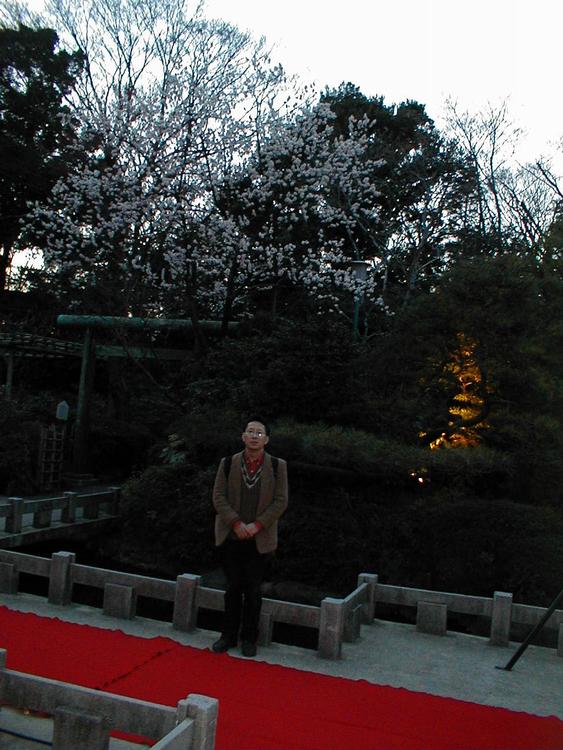 Close-up of Masatoshi and cherry blossoms.