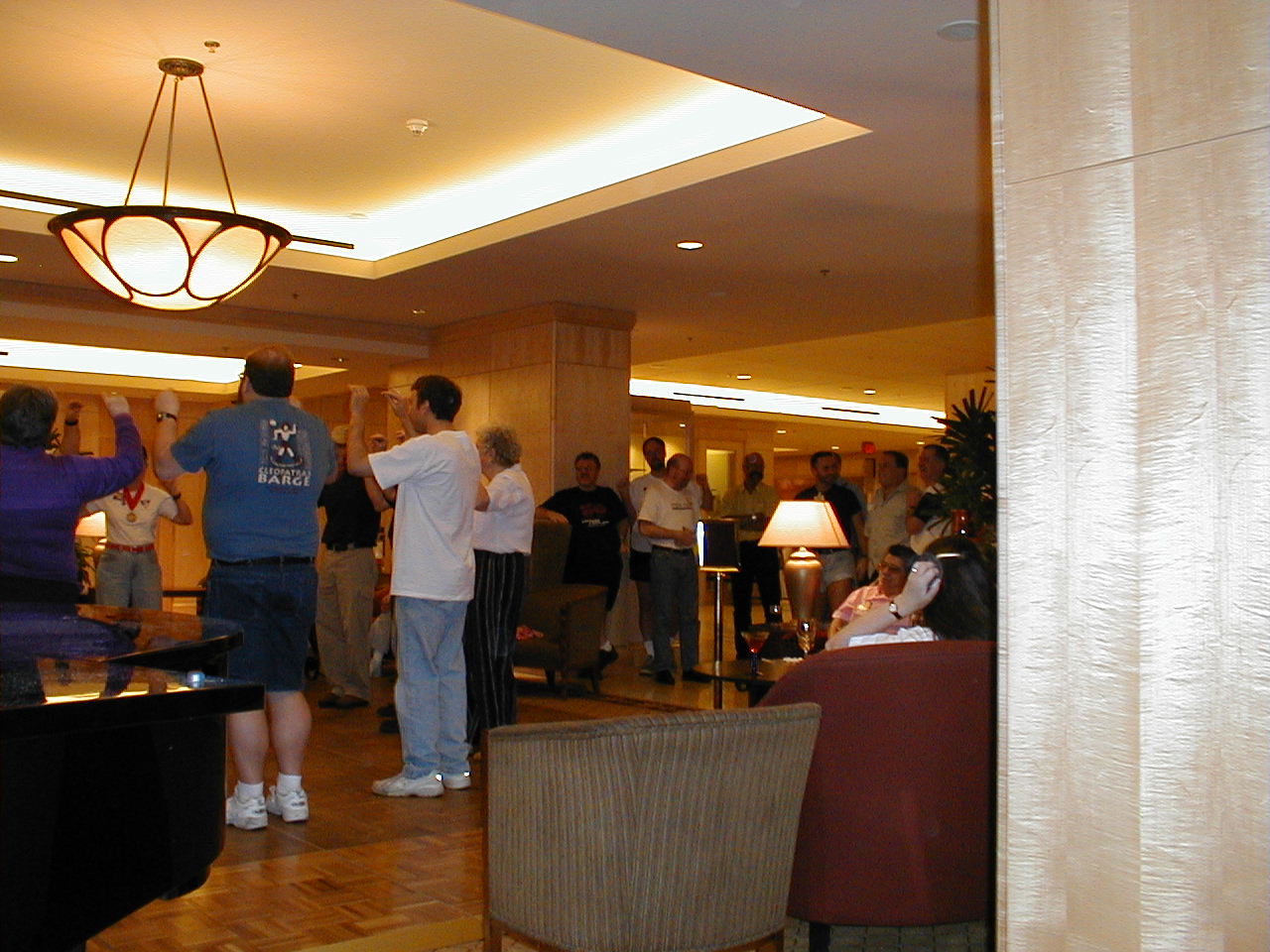 Doing the funcky chicken in the hotel bar.