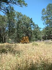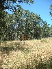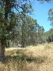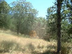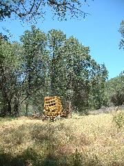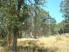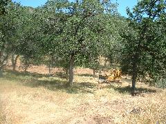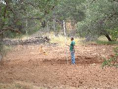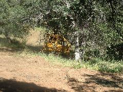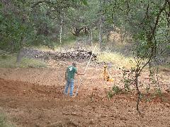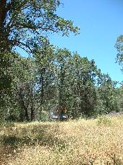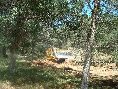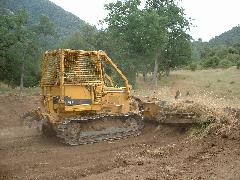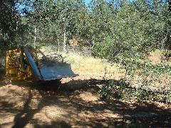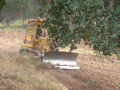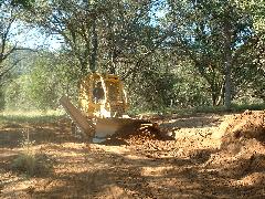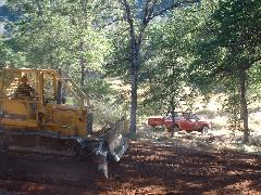 Mark's dozer got stuck on a tree-root, so we took a break. Then Mark sawed through the root using our battery-powered chain saw.