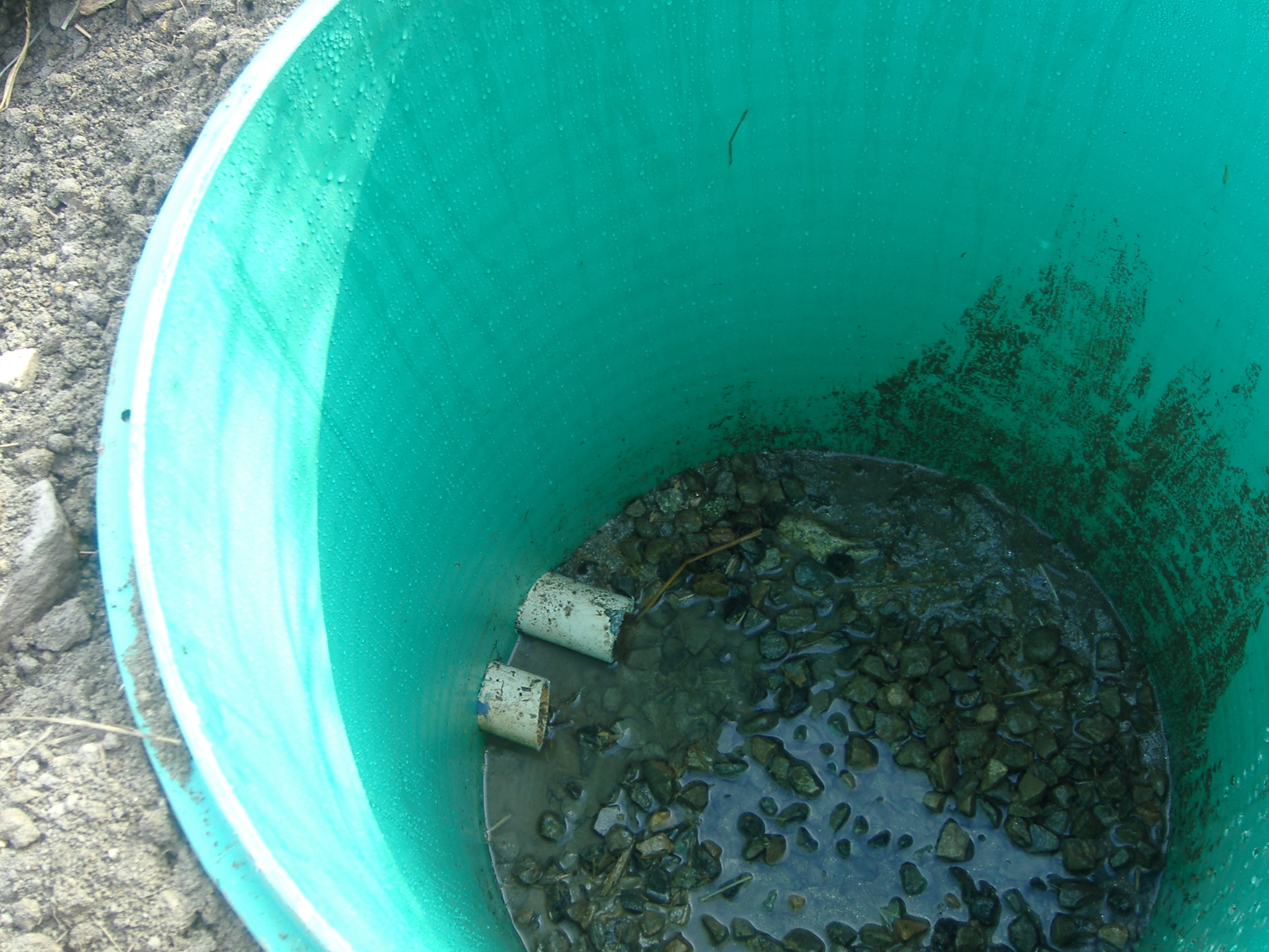 Two new buried 2" pipes lead from the new spring-box: The higher flowlow pipe feeds the old tank. The lower pipe goes through a sediment filter to a new 3000-gallon tank on the hillside. That tank feeds to a filter lower down, and hence to the home-side.