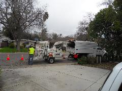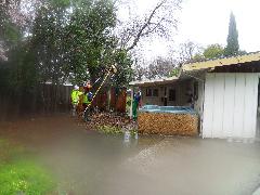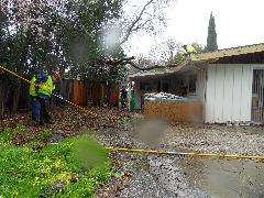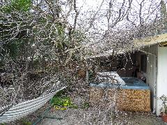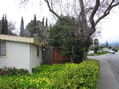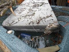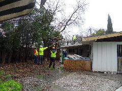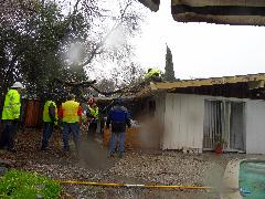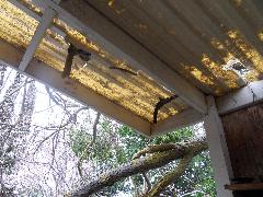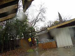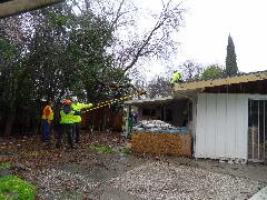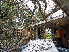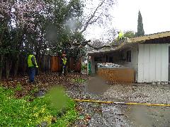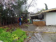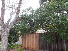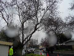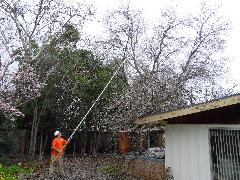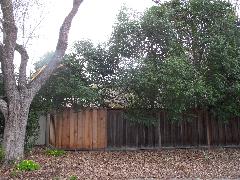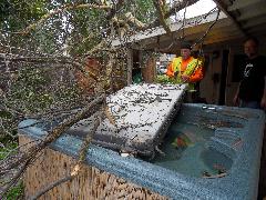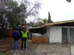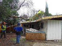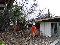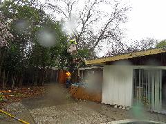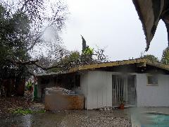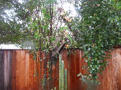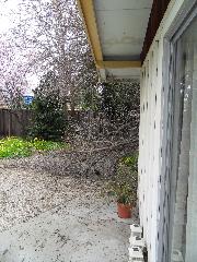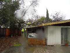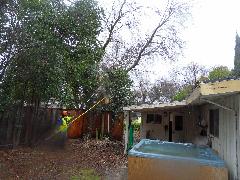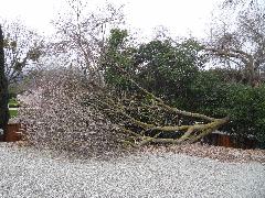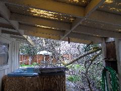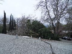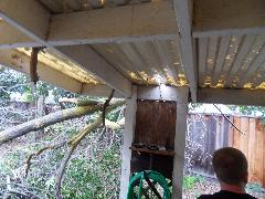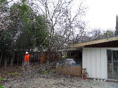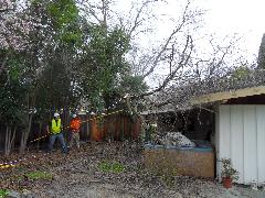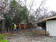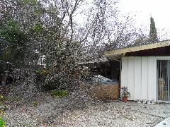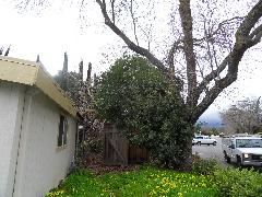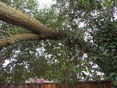 On a blustery day in February, Per and Nathan were enjoying the hot-tub. We heard cracking noises and finally pin-pointed them to the Modesto Ash just outside the fence. We were starting to get nervous when a big heavy branch started falling towards us. Nathan managed to scramble out; Per had to settle for standing up against the house wall and under the eave as the tree fell. Neither of us got a scratch.